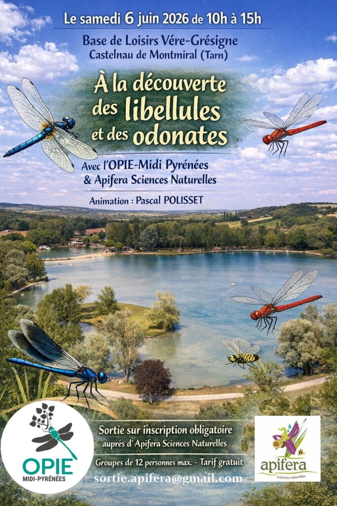 Le samedi 6 juin 2026 de 10h à 15h à la base de loisirs Vère-Grésigne sur la commune de Castelnau de Montmiral (Tarn) : « A la découverte des libellules et des odonates » animée par l’OPIE-Midi Pyrénées, organisée par Apifera Sciences Naturelles.